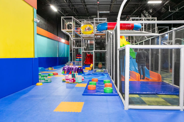 A protected play space with a merry go round, ball pit, climbing wall, kid size slide, and large LEGO block building area. Best for ages 1 to 4.